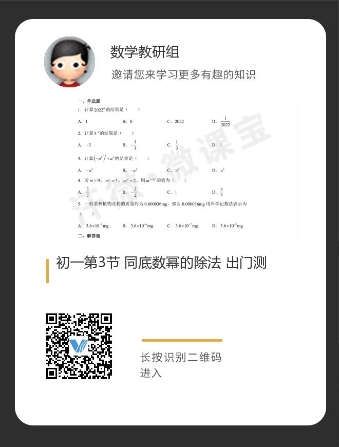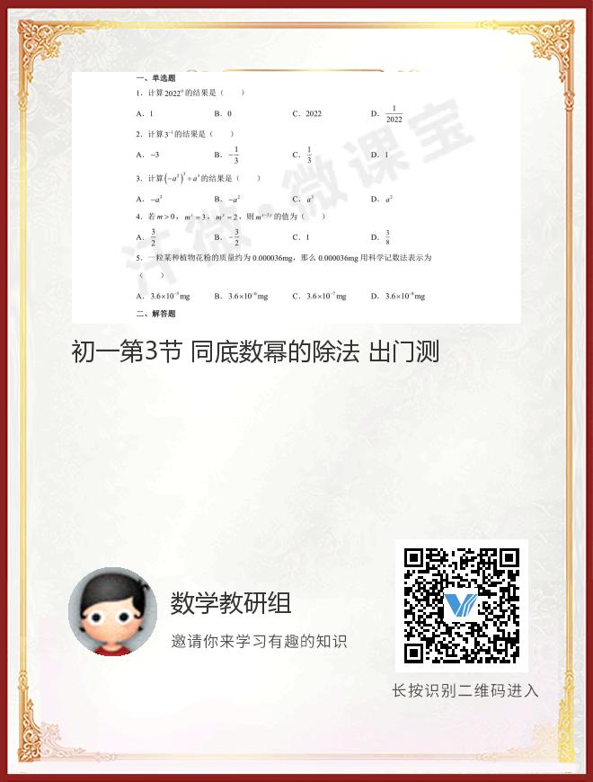 正在播放:初一第3节 同底数幂的除法 出门测