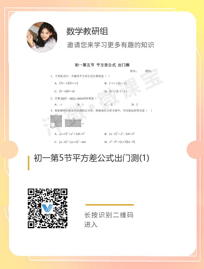 正在播放:初一第5节平方差公式出门测(1)